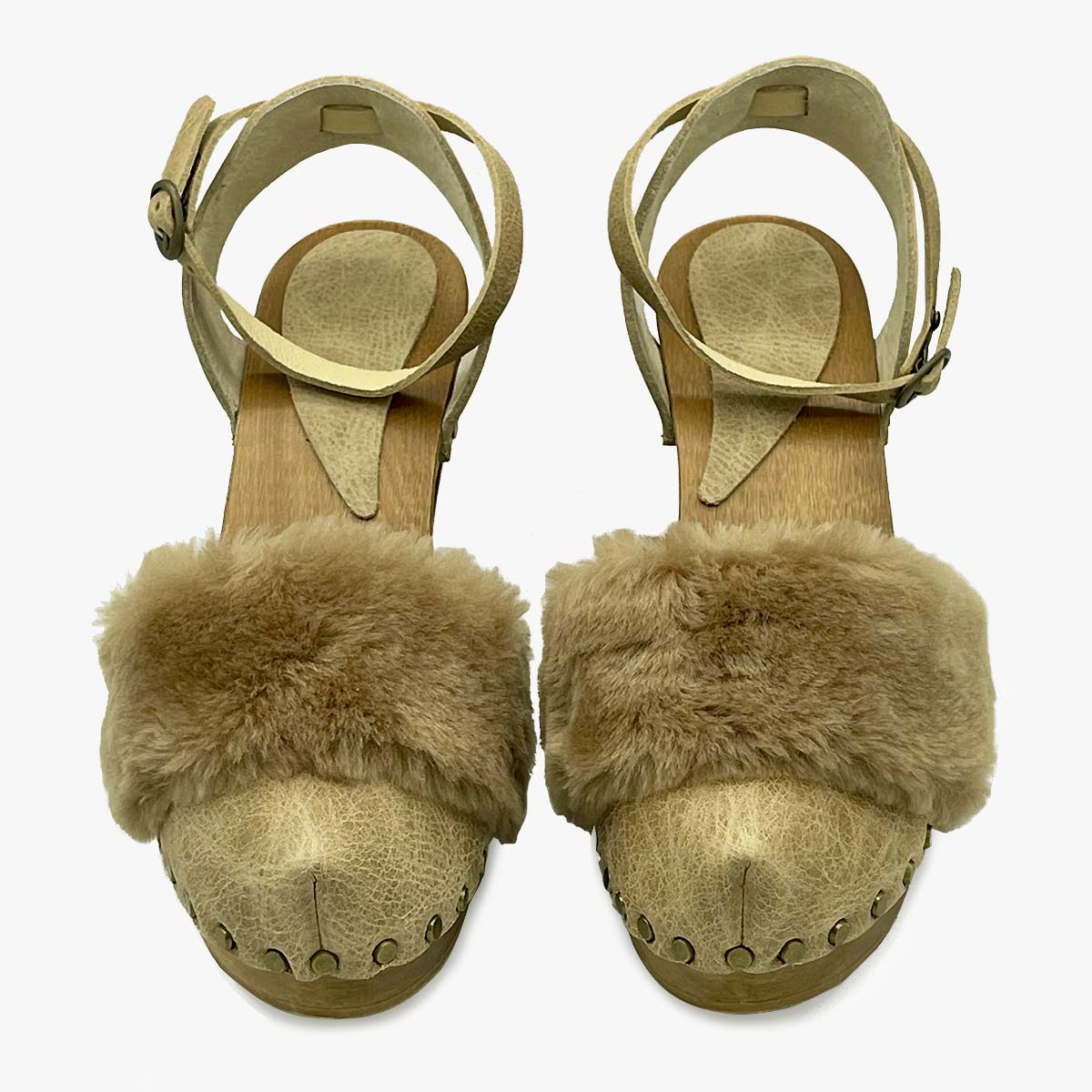 Sandali in pelo e pelle con cinturino in pelle, sottopiede e tacco in legno di faggio con inserto in gomma flex.