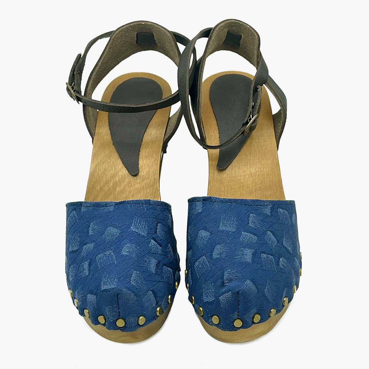Sandali in stoffa chiusi sulla punta con cinturino doppio in pelle, sottopiede e tacco in legno di faggio con inserto in gomma flex.