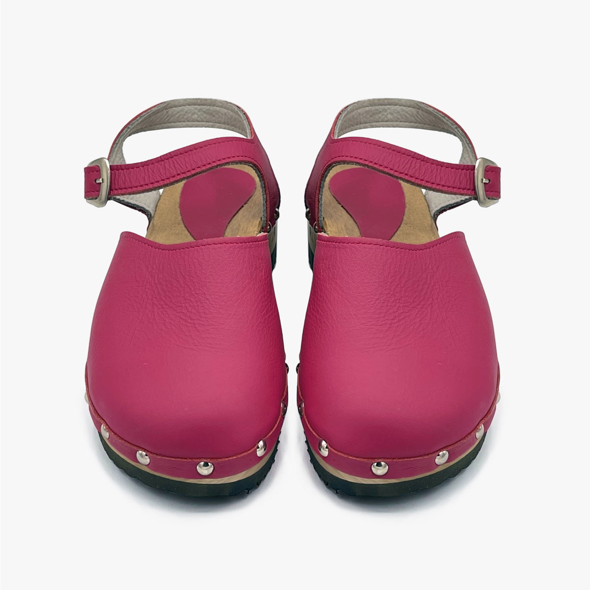 Sandali in pelle con borchie argento e cinturino in pelle, sottopiede e tacco in legno di faggio con inserto in gomma flex.